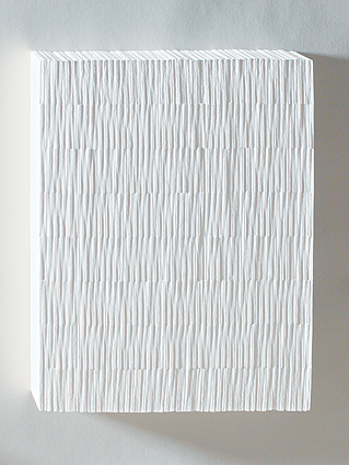 Festlegung der Objektgröße auf 40x30cm. Karton-Tafeln 70x100cm groß und 3mm stark wurden in Streifen mit je 40mm Breite manuell geschnitten. Dies bedeutet, dass z.B. bei der 1cm-Version, die Reihen aus 30 1cm breiten Stücken bestehen. Danach wurden solange Reihen übereinander-geklebt, bis eine Objekthöhe von 40cm entstand. Anschließend wurde die neu entstandene Form (bei 1cm Stücken ca. 4.000 Einzelteile) mehrmals mit weißer Acylfarbe bemalt. Analog entstanden dazu, nach dem gleichen Konzept, Objekte mit 2,3,4,5,10 und 30cm-Stücken. Ebenso entstand eine vertikal aus-gerichtete Version. Intuitiv unterteilte Versionen entstanden »pur« und bemalt. Weiterhin wurden jeweils horizontal und vertikal aus-gerichtete Outline-Versionen erstellt.